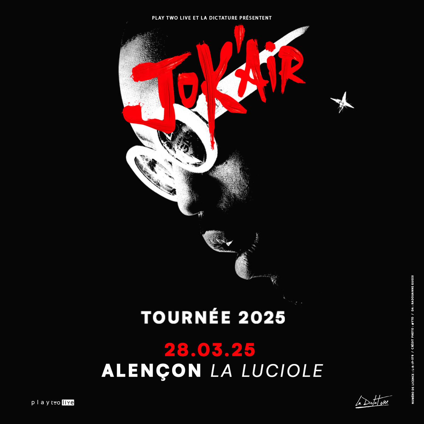 Jok’Air, figure incontournable du rap français, s’empare de la scène de La Luciole pour un concert unique. Reconnu pour son style inclassable et sa sincérité brute, Jok’Air mêle rap, mélodies et émotions pour offrir une performance intense. Après des tournées à guichets fermés et des tubes certifiés, Big Daddy Jok revient en force avec une nouvelle tournée en 2025. Ses textes, à la fois personnels et percutants, témoignent de sa vie et de son parcours atypique. Ne manquez pas l’occasion de vivre cette expérience musicale authentique qui fait vibrer la scène française !